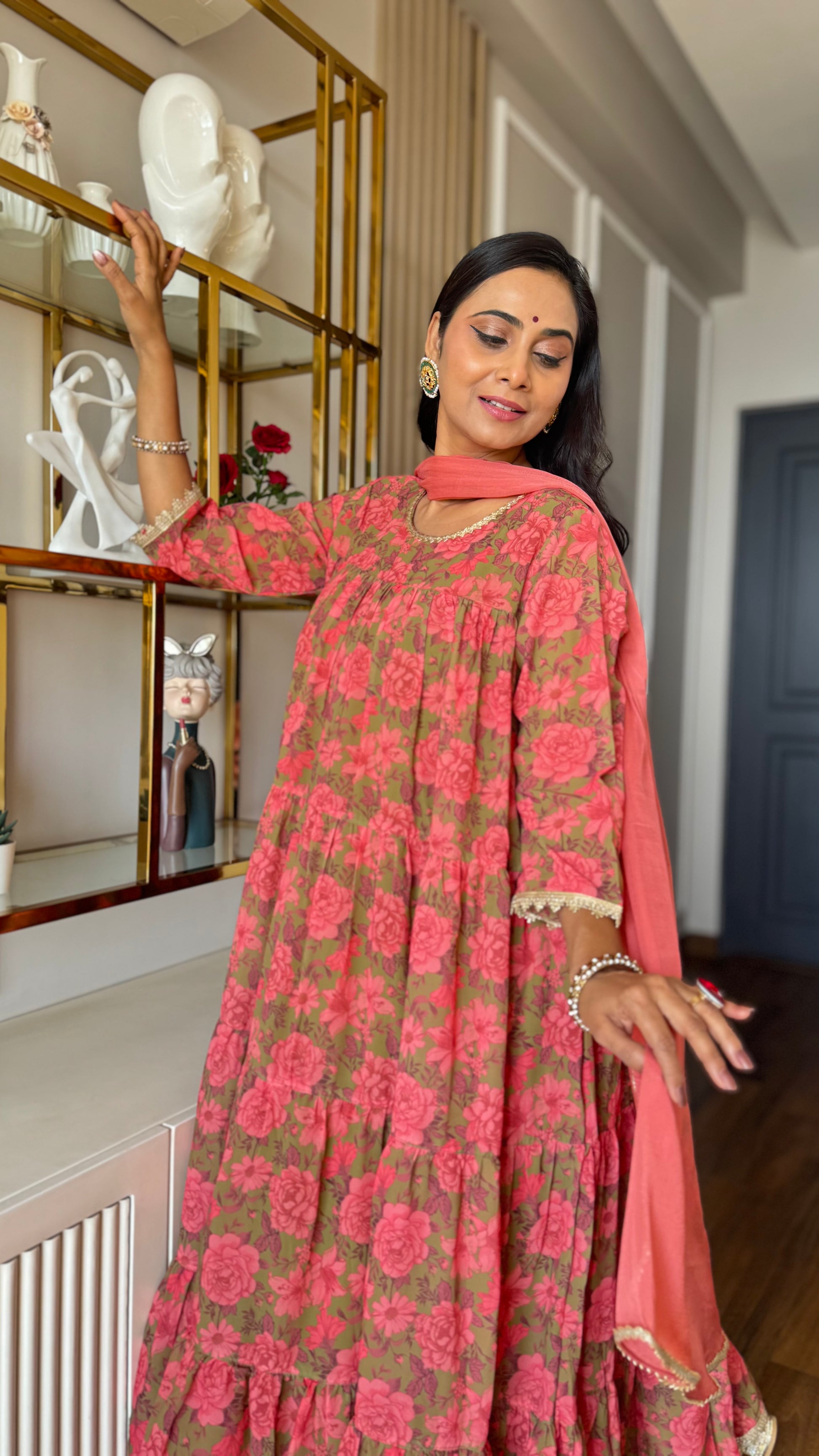 - Kurta Length: 50(inch) | Bottom Length: 38(inch) | Kurta Color: Olive | Pattern: Digital Floral Printed | Occasion: Festive | Type: Tiered | Sleeve Type: 3/4th Sleeves Regular Sleeves