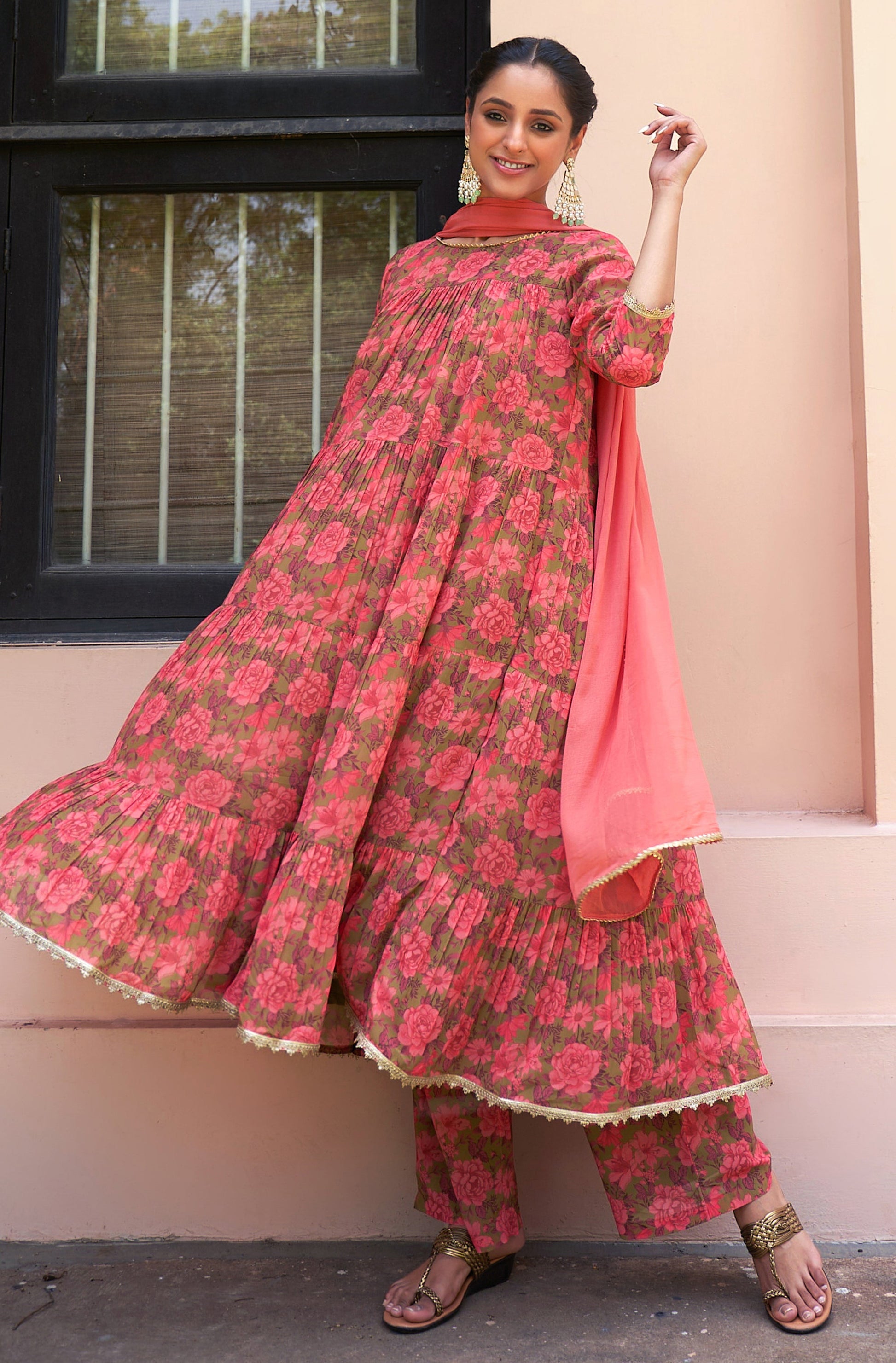 - Stunning olive georgette digital floral printed kurta palazzo set with solid peach chiffon dupatta by CRAFTYSTYLE, designed for all festive occasions. The set features a tiered kurta with digital floral prints all over, 3/4th regular sleeves and a round neck, providing a comfortable and stylish fit. Adorned with gota-work at the neckline, sleeve hem, hemline and dupatta border. The ankle-length kurta is designed with gathers, creating a flowy and flattering drape. The kurta is paired with printed palazzo made from georgette fabric in olive color and features a matching floral prints with a fully elasticated waistband and a comfortable fit. To complete the look, a solid peach chiffon dupatta featuring a gota work deatiling at the borders is added to a set.
